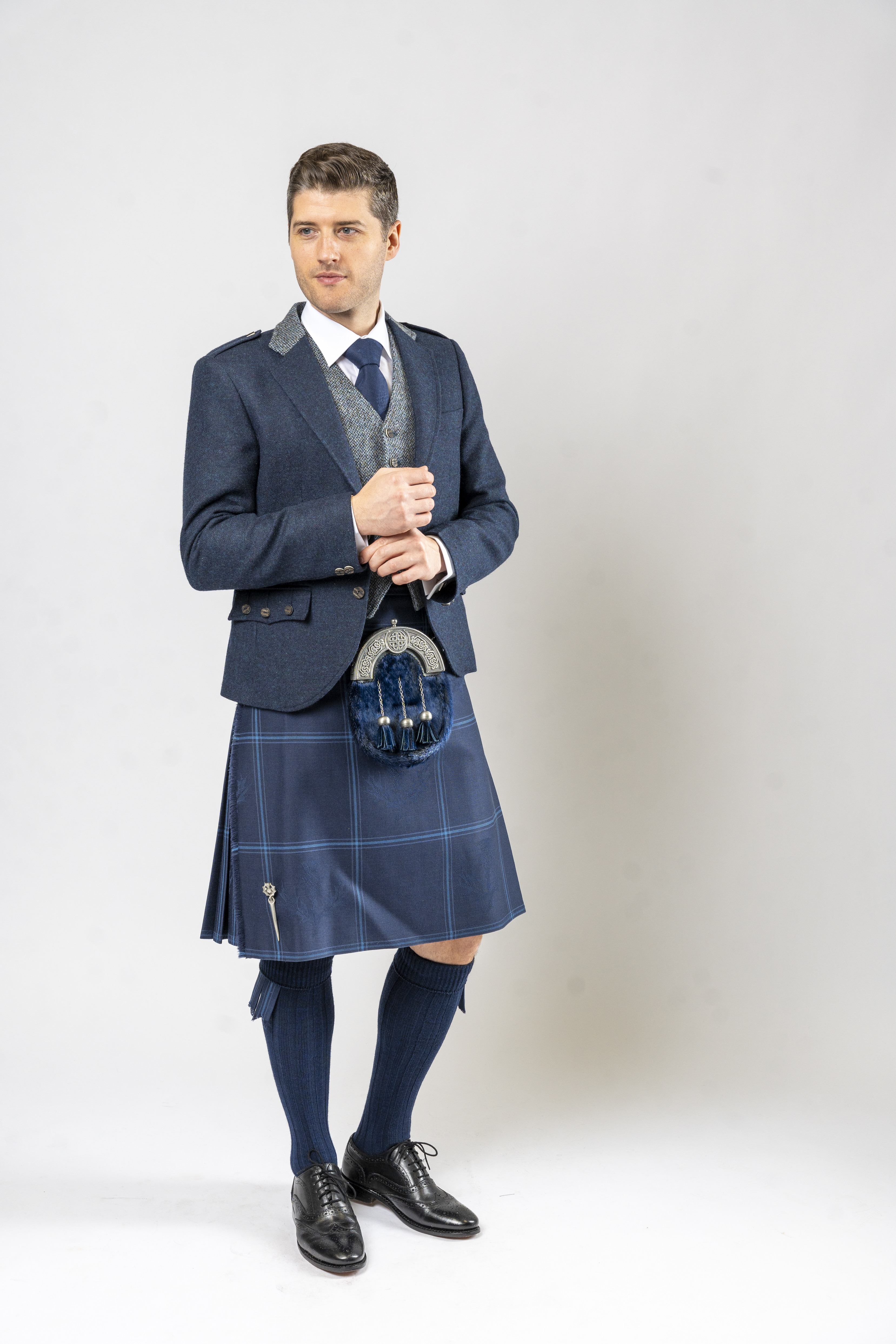 Paired with a contrasting waistcoat in specialist Harris Tweed, the ensemble gains a striking dimension of texture and colour, elevating the outfit to a truly refined Highland statement. The imitation staghorn buttons further enhance the contemporary appeal, while the dark navy tone perfectly complements a variety of tartans — particularly purples and blues such as Loch Tay.