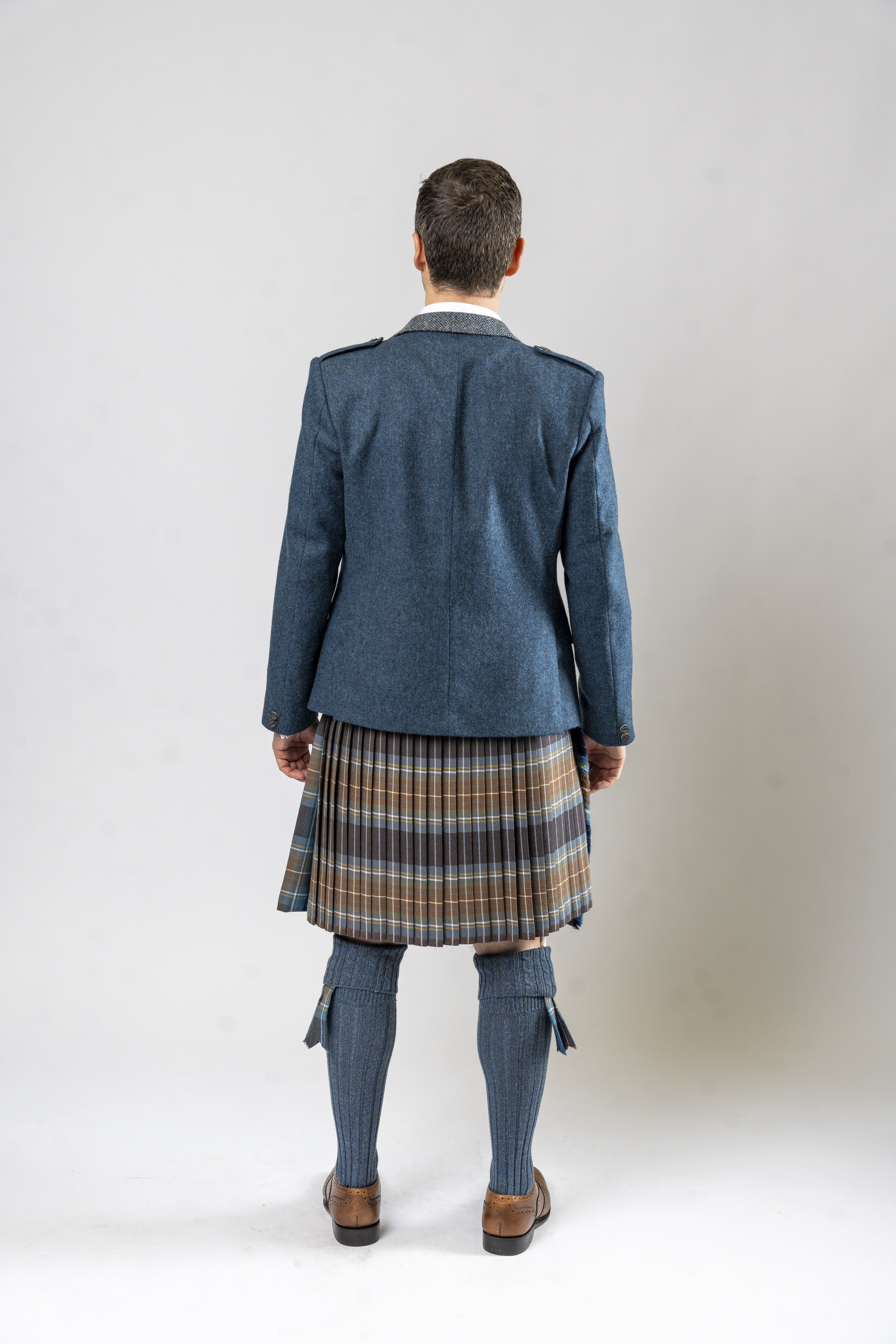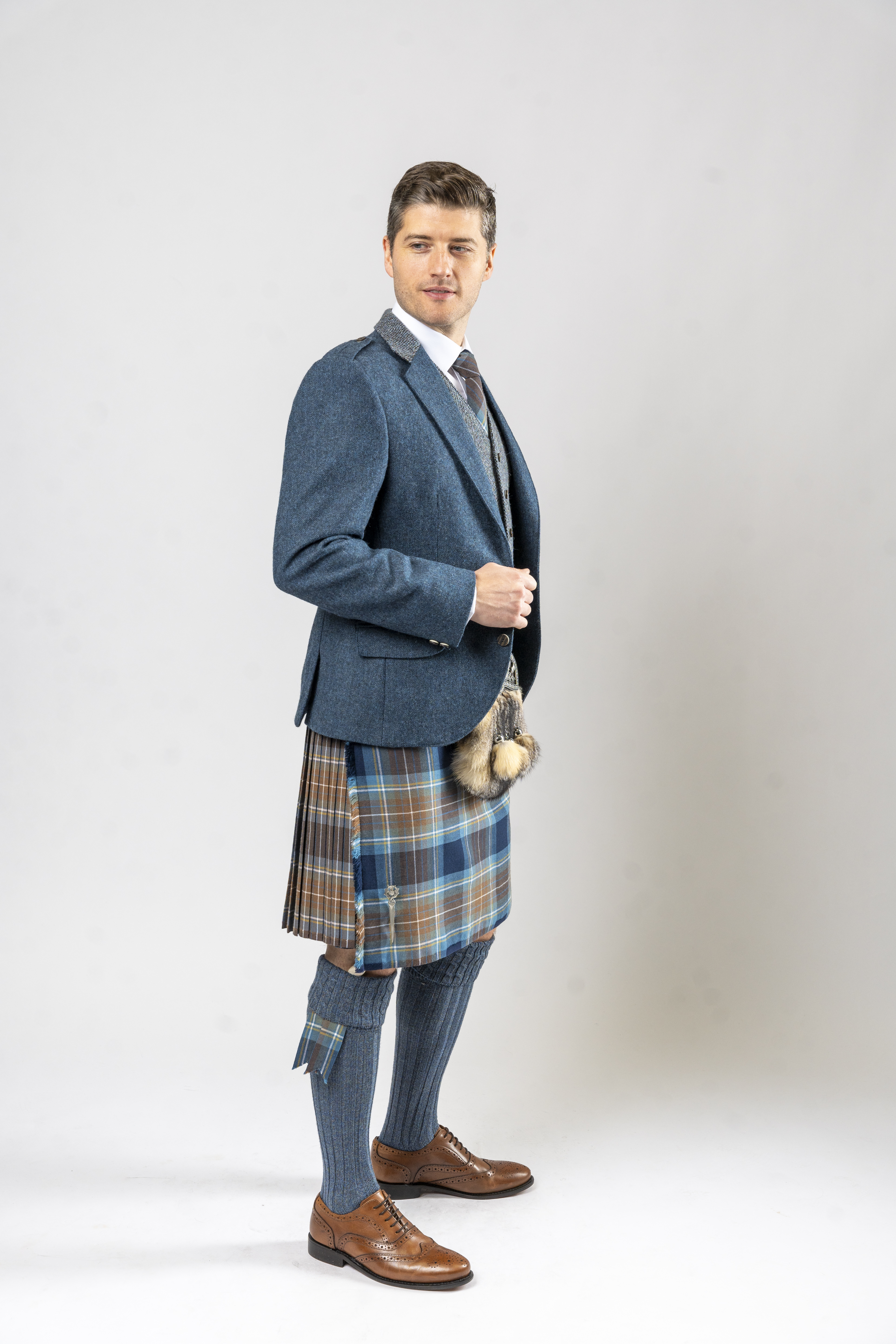 Paired with a contrasting waistcoat in specialist Harris Tweed, the ensemble introduces texture and subtle colour contrast, perfectly complementing blue-toned tartans such as Loch Tay, Holyrood, or Lovat Blue kilts. Imitation staghorn buttons add a refined touch, enhancing the jacket’s contemporary appeal while maintaining a classic Highland aesthetic.