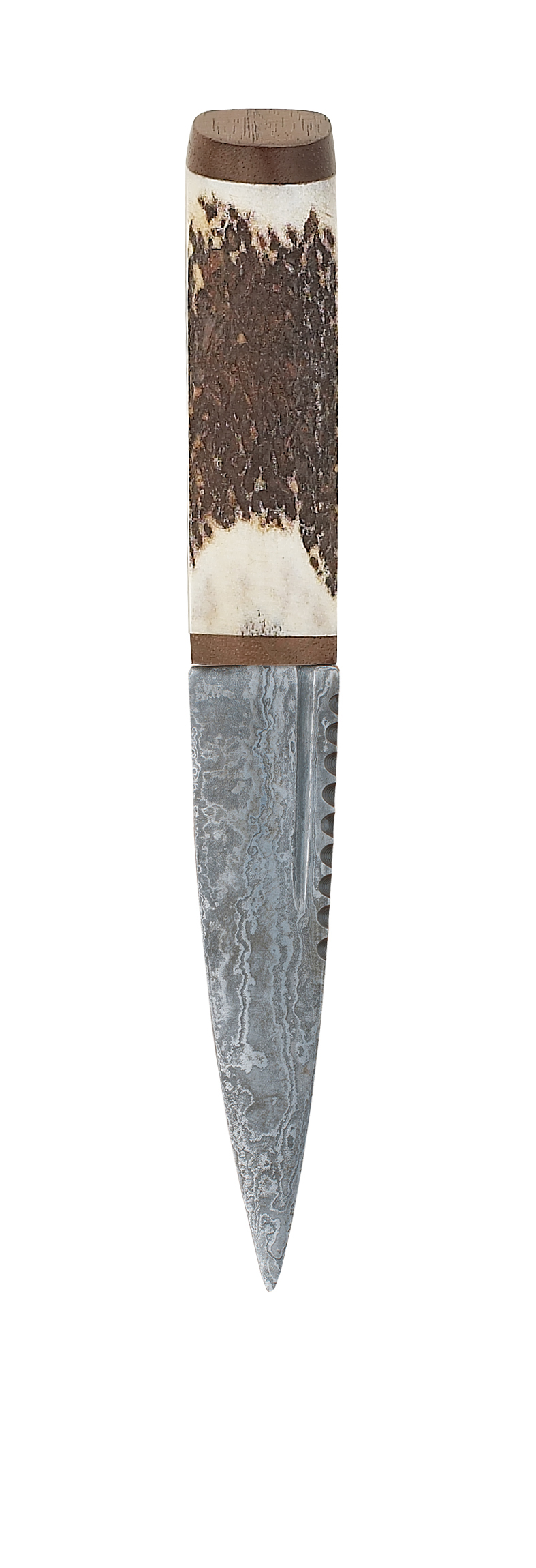 Scottish Staghorn Damascus Blade Sgian Dubh with Brown Leather Sheath. The staghorn handle is finished with walnut on the back and top. Supplied in a black presentation box.