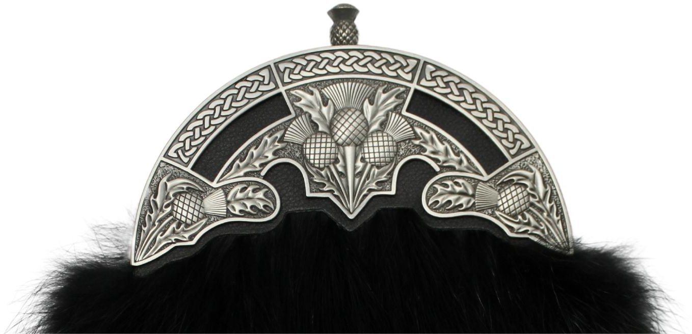 Presenting the Antique Thistle Black Raccoon Sporran—a distinguished accessory that seamlessly combines tradition with timeless style. Crafted with an antique finish, this sporran features luxurious black raccoon fur, adorned with the iconic thistle motif. Elevate your dress attire with the unique charm and craftsmanship embodied in this exquisite sporran, making it a perfect complement to formal Highland dress.